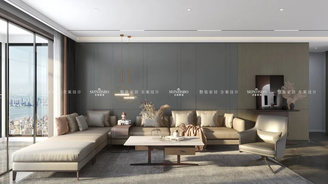 大跨度观景窗落设计,让人置身其中,宛如漂浮在云端,演绎了空中盛宴。陪家人看一场完整的日出日落,观赏水自天际流,细细谱写着一首与自然有关的小诗,温柔而细腻的氛围感盈满其间。
