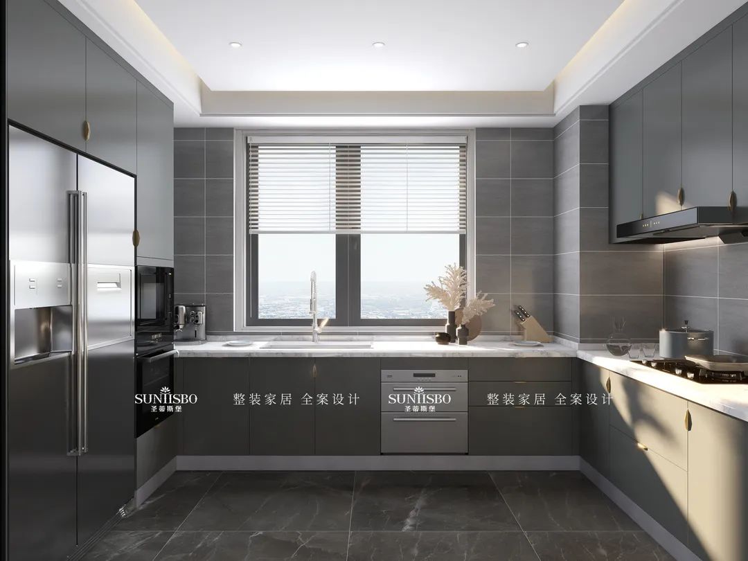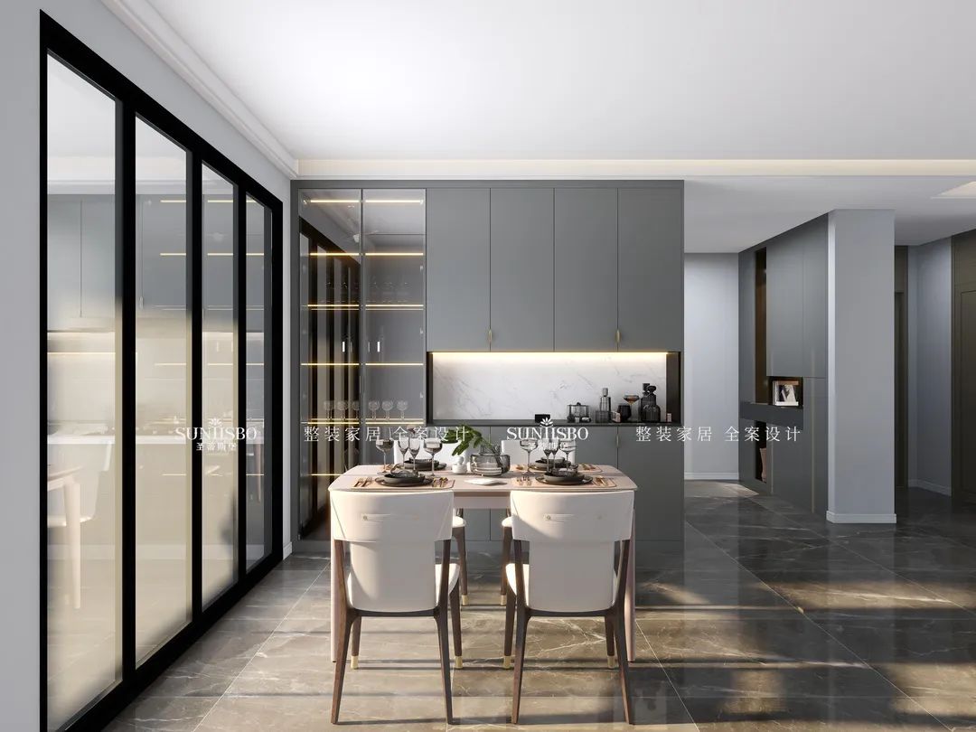 餐厅的设计采用整墙定制的餐边柜,高级灰让空间调性瞬间得到提升,半透明的玻璃展示区,营造了多样的空间和充满极简艺术气息的生活体验。