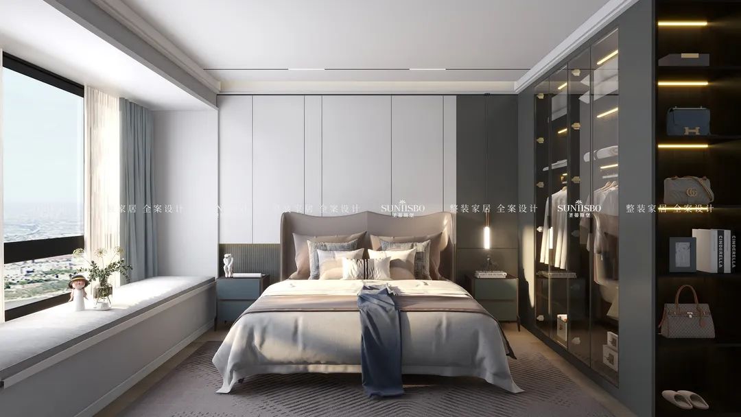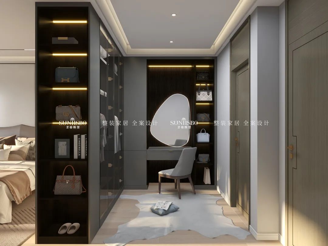 拥有一个专属衣帽间是很多女生的梦想。设计师回归生活本质,究其外,是空间;究其内,是材质、灯光,内外融合,比例和谐。通过不规则状的玻璃镜面设计,在时尚高级的定制空间中,倾诉着创意的真实和温度,不仅扩大了衣帽间视觉范围,同时也给予了空间个性鲜明的艺术格调。